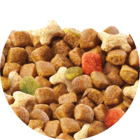 Zboża (pełne ziarno 55%), mięso i produkty pochodzenia zwierzęcego (15%, w tym kurczak 4%), oleje i tłuszcze, produkty pochodzenia roślinnego, roślinne ekstrakty białkowe, minerały, warzywa odwodnione (0,6%), cukry, mleko i produkty mleczne w granulkach w kształcie kości (0,7%).