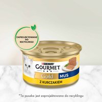 Kompletna karma mokra z kurczakiem w postaci musu przeznaczona dla kotów dorosłych.