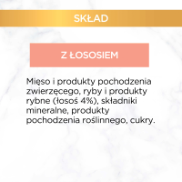 Mięso i produkty pochodzenia zwierzęcego, ryby i produkty rybne (łosoś 4%), składniki mineralne, produkty pochodzenia roślinnego, cukry