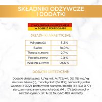 Skład: Mięso i produkty pochodzenia zwierzęcego (w tym wołowina 6%, kurczak 8%), roślinne ekstrakty białkowe, zboża, warzywa (2,8% koncentratu pomidorowego, odpowiednik 4% pomidorów w sosie), ryby i produkty rybne, składniki mineralne, cukry.