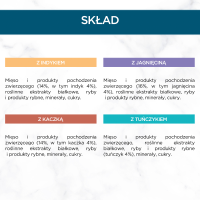 z indykiem: mięso i produkty pochodzenia zwierzęcego (14 %, w tym indyk 4 %), roślinne ekstrakty białkowe, ryby i produkty rybne, minerały, cukry