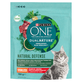 Pyszny smak i zbilansowana receptura: karma Purina ONE Dual Nature Spirulina, wołowina łączy w sobie wszystkie zalety, jakich oczekuje się od karmy pełnoporcjowej dla kotów po kastracji lub sterylizacji.