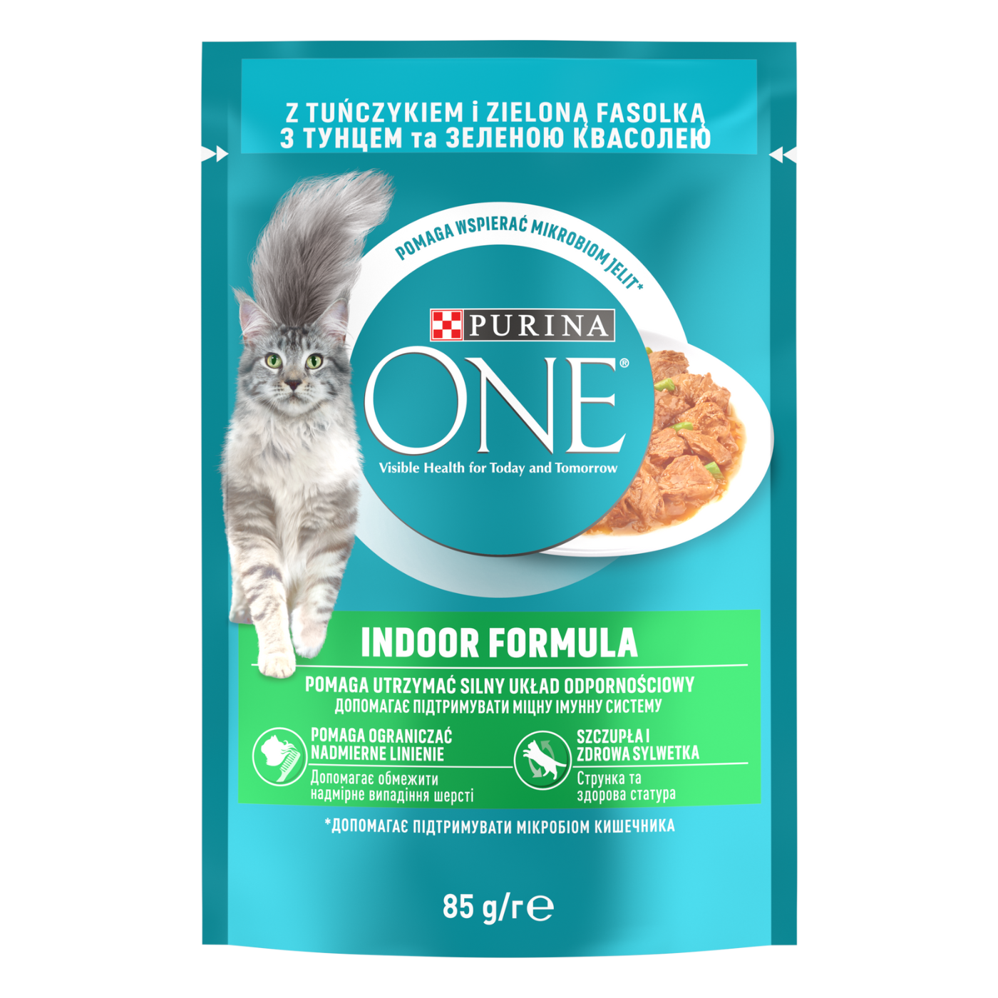 Purina One Indoor Formula to pełnoporcjowa karma mokra dla dorosłych kotów przebywających głównie w domu. Została opracowana tak, aby wspierać zdrowie, odporność oraz utrzymanie szczupłej sylwetki. Zawiera tuńczyka (4%) – źródło wysokiej jakości białka, które pomaga utrzymać mięśnie w doskonałej kondycji, oraz zieloną fasolkę (5,4% w przeliczeniu na świeży produkt), która wspomaga trawienie i ogranicza powstawanie kul włosowych.