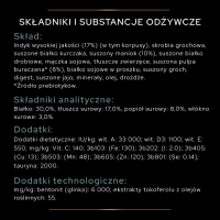 Pomagającą poprawić konsystencję kału: karma zawiera specjalne składniki dla zdrowego trawienia i pomaga utrzymać dobrą konsystencję odchodów.