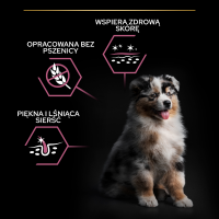 PURINA PRO PLAN Medium Puppy Sensitive Skin z formułą OPTIDERMA to pełnoporcjowa sucha karma, opracowana specjalnie dla szczeniąt ras od 10 do 25kg, które mają wrażliwą skórę. Odpowiednia również dla suk ciężarnych i karmiących. Karma o smaku łososia z ryżem.