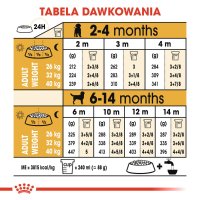 | Masa ciała dorosłego psa | 2 miesiąc | 3 miesiąc | 4 miesiąc | 5 miesiąc | 6 miesiąc | 7 miesiąc | 8 miesiąc | 9 miesiąc | 10 miesiąc | 11 miesiąc | 12 miesiąc | 13 miesiąc | 14 miesiąc | 15 miesiąc |