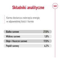 Receptura karmy zapewnia prawidłowy pasaż jelitowy i optymalną konsystencję kału, dzięki zawartości wysoko przyswajalnego białka L.I.P.