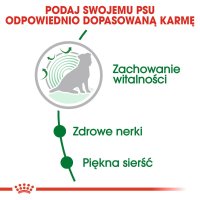 Karma ROYAL CANIN Mini Ageing 12+ charakteryzuje się dostosowanym poziomem fosforu, sprzyjając prawidłowemu funkcjonowaniu nerek. Receptura sprzyja także utrzymaniu prawidłowej kondycji skóry i sierści.