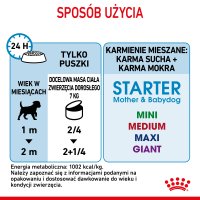 Skład karmy ROYAL CANIN Starter Mousse Mother & Babydog dostosowany jest do potrzeb żywieniowych szczeniąt do 2 miesiąca życia, a także dzięki delikatnej formie musu ułatwia szczeniętom przechodzenie z pokarmu płynnego (mleko matki) na stały. Receptura karmy jest także dostosowana do zwiększonych potrzeb pokarmowych suk w ostatnim etapie ciąży oraz w laktacji.