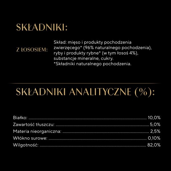 Mięso i produkty pochodzenia zwierzęcego* (96% naturalnego pochodzenia), ryby i produkty rybne* (w tym łosoś 4%), substancje mineralne, cukry. *Składniki naturalnego pochodzenia.