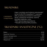- Mięso i produkty pochodzenia zwierzęcego (43%, z czego 92% naturalnego pochodzenia, w tym 4% królika, 4% kaczki)