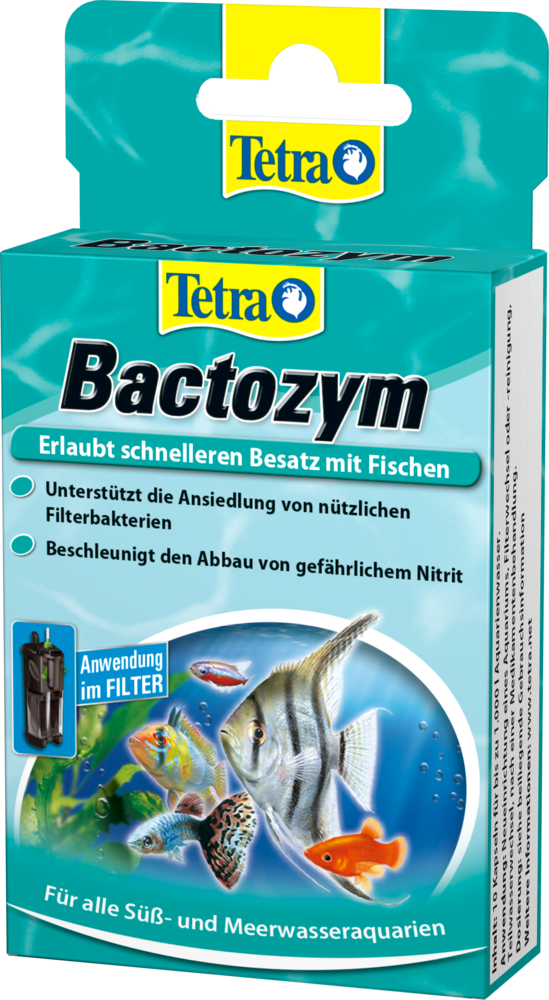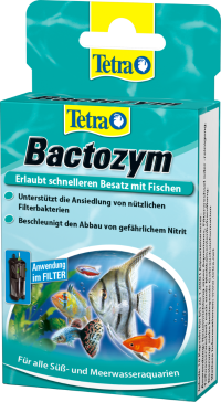 Tetra Bactozym przyspiesza biologiczną aktywację akwarium. Naturalne, organiczne koloidy pokrywają wkład filtra i wszystkie powierzchnie niewidoczną warstwą, wspomagającą rozwój kolonii pożytecznych bakterii filtracyjnych. Oznacza to możliwość wpuszczenia pierwszej partii ryb już po 24 godzinach od przygotowania nowego akwarium. Zarówno wodę, jak i filtr można wymieniać bez istotnej utraty aktywności biologicznej. Starannie dobrane enzymy pomagają zmniejszyć zanieczyszczenie i utrzymują krystalicznie czystą wodę. Ułatwia i przyspiesza namnażanie się bakterii filtracyjnych (rozkład amoniaku i azotynów). Wspomaga rozkład zanieczyszczeń organicznych. Zarówno wodę, jak i filtr można wymieniać bez istotnej utraty aktywności bakterii.
