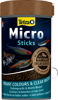 Tetra Micro Sticks to produkt w pałeczkach przeznaczony do karmienia niewielkich rybek tropikalnych. Zawartość zarówno karotenoidów w czerwonych pałeczkach jak i wysokiej jakości składników roślinnych w zielonych zapewnia pełnowartościową dietę jednocześnie wzmacniającą wybarwienie. Pałeczki mają średnicę 0,75-0,9mm i długość między 1,5 a 2,5mm. Małe granulki są idealne dla małych ryb, ponieważ szybko miękną w wodzie, dzięki czemu są łatwe do jedzenia. Podsumowując, Tetra Micro Menu to idealna mieszanka pokarmowa dla wszystkich małych ryb ozdobnych, a także młodych, rosnących pielęgnic i ryb morskich.
