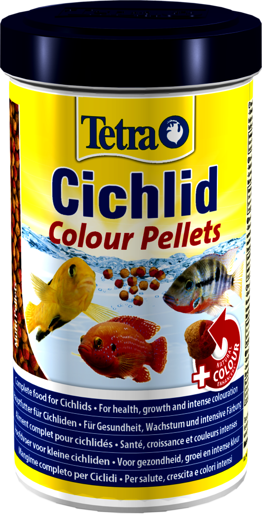 Tetra Cichlid Colour Pellets to kompletny, wybarwiający pokarm dla pielęgnic dostępny w dwóch granulacjach. Duża zawartość białek wspiera rozwój a formuła Multi Pellet bogata w naturalne substancje wzmacniające koloryt intensyfikuje wybarwienie żółtych, pomarańczowych i czerwonych ryb tropikalnych.