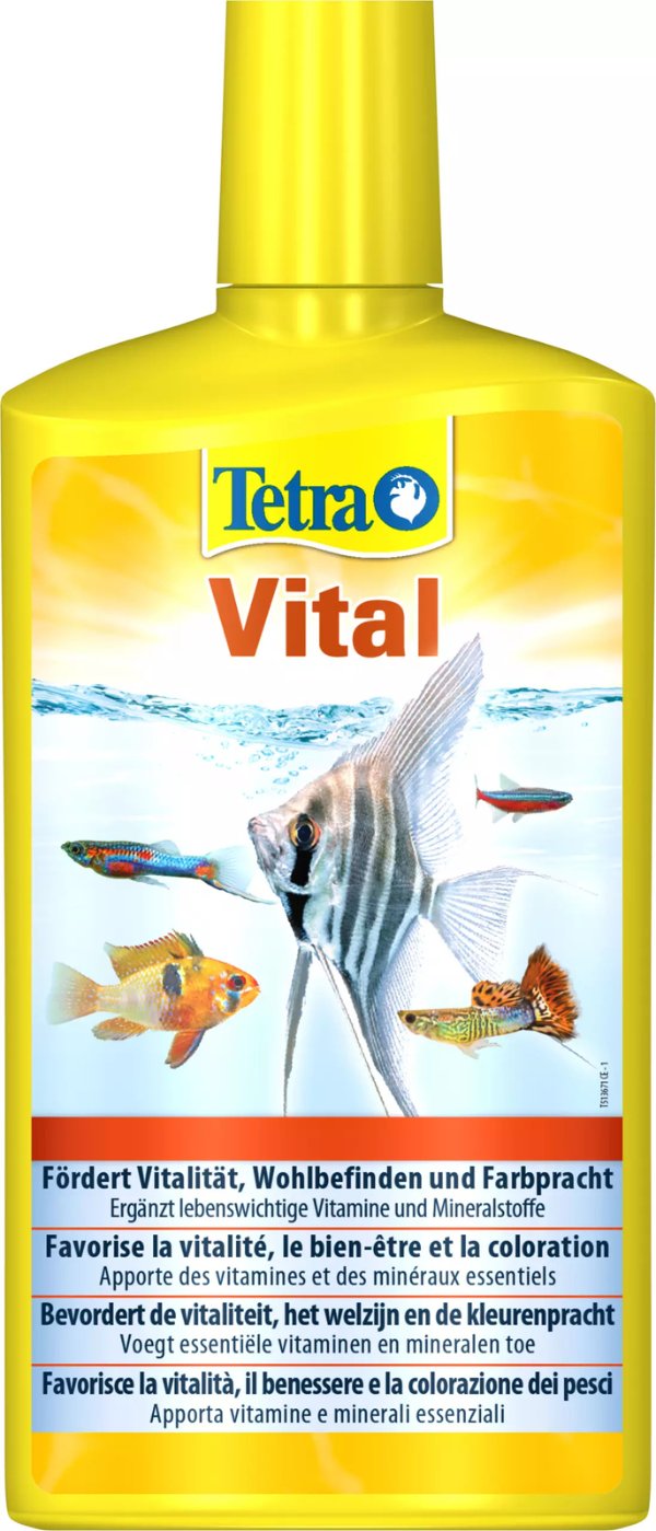 Tetra Vital to preparat wspomagający witalność, dobre samopoczucie i naturalne zabarwienie ryb. Tetra Vital wzbogaca wodę w cenne witaminy, minerały i pierwiastki śladowe pochodzące z naturalnego środowiska ryb, których nie zawiera woda z kranu albo które zostały już wyczerpane w akwarium. Pozwala to stworzyć niemal naturalne środowisko, w którym ryby czują się swobodnie i rozwijają swoje naturalne zabarwienie. Naturalnie aktywne witaminy z grupy B poprawiają witalność i obniżają stres. Magnez poprawia samopoczucie i sprzyja zdrowemu rozwojowi. Pantenol chroni błony śluzowe ryb. Jod pomaga przygotować się rybom do godów i zwiększa szanse na pomyślność tarła. Do stosowania we wszystkich typach akwariów słodkowodnych.
