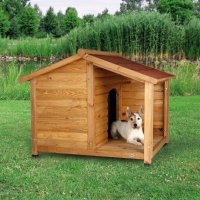 Buda dla psa z lakierowanego drewna sosnowego, z zadaszonym tarasem. Jej dach jest pokryty filcem mineralnym, klapy dachowe mogą być otwierane osobno. Regulowana wysokość nóżek dla pewnego osadzenia budy.