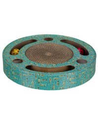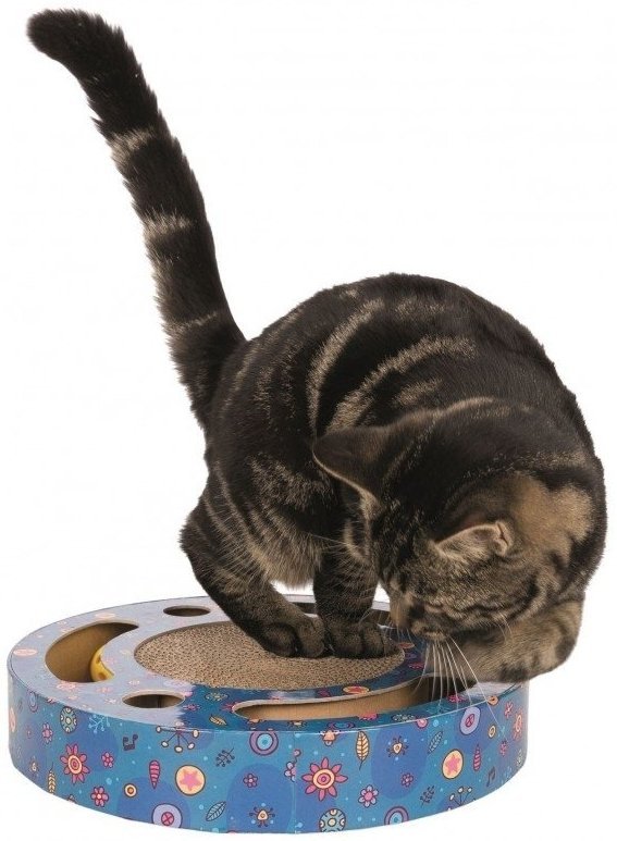 Drapak owalny z zabawkami dla kota. Drapak leżący dla kota wykonany został z twardej tektury mającej zapewnić zwierzęciu odpowiednie warunki do wbijania pazurków. Tektura jest zarazem na tyle wytrzymała, że drapak będzie długo służył kotu, a z drugiej strony jest na tyle miękka, że nie może w żaden sposób zaszkodzić zwierzęciu. Produkt należy ułożyć na płasko. W obrębie zabawki wykonane zostały półotwarte tunele z piłeczkami.