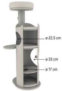 Drapak stojący Juana posiada trzy poziomy z miękkimi legowiskami dla kota. Drapak wyposażony jest także w słupek z sizalową powierzchnią, która sprawdzi się doskonale do ostrzenia pazurów. Wielofunkcyjny do wspinania się, ostrzenia pazurków, zabaw i wypoczynku. Dużo powierzchni do drapania: z powleczonym naturalnym sizalem słupkiem i sizalową powierzchnią na jaskini. Jaskinia idealna do schowania się i oddania relaksującej drzemce. Pluszowa piłeczka z grzechotką, pobudza kotka do zabawy. Platforma widokowa z legowiskiem idealny punkt do obserwacji otoczenia.