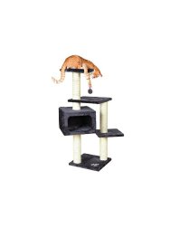 Drapak Palamos jest jednym z większych i najbardziej rozbudowanych drapaków w ofercie tego producenta. Na solidnej jego podstawie i dwóch słupkach zainstalowane są, aż trzy platformy oraz komfortowa budka z dużym wejściem. Kontrastujące kolory ciemnego pluszu obicia i jasnego sizalu na słupkach powodują ich drapak jest wyjątkowo elegancki. Do górnej platformy przyczepiony został pluszowy pompon na sznurku ulubiona zabawka większości mruczków.