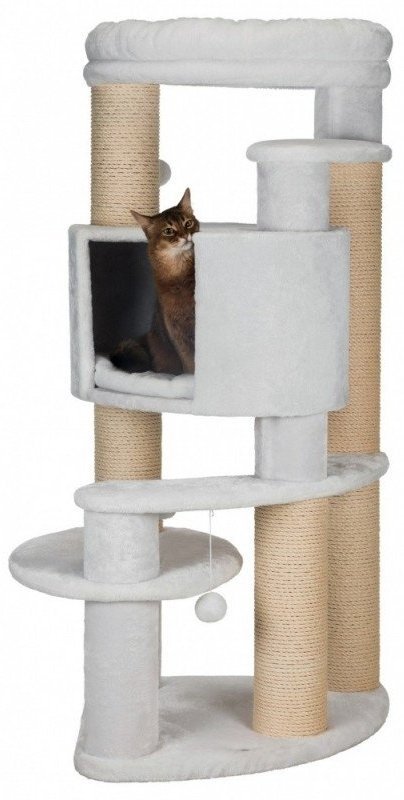 Drapak posiada słupki owinięte wyjątkowo grubym, naturalnym sizalem i pluszem. Kocie pazurki z tego rodzaju drapakiem już nigdy nie będą zaniedbane. Pluszowe obicie w białym kolorze wykwintnie się prezentuje, a przede wszystkim jest szczególnie komfortowe i miłe w dotyku. Wyściełane platformy. Twój kot odnajdzie upragniony spokój na legowisku, które dla wygody pupila, wyłożono od wewnątrz pluszem. Drapak posiada także platformę ze zdejmowanym legowiskiem. Z zabawką na sznurku.