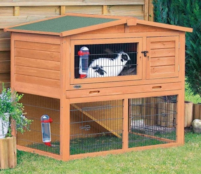 Klatka dla małych zwierząt z wybiegiem 2 poziomy. Z lakierowanego drewna sosnowego. Solidne okratowanie druciane, malowane proszkowo. Dach pokryty filcem z wełny mineralnej. Posiada kryjówkę. Klapy dachowe otwierane od góry. Panele na ściance tylnej chronią przed wiatrem. Zamykana klapa z plastikowym pokryciem.