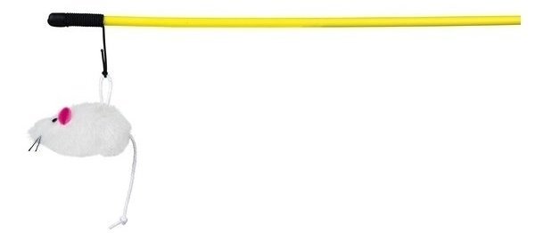 Plastikowa półmetrowa wędka z przyczepioną na długiej gumce myszką to świetna zabawka dla kota i jego właściciela.