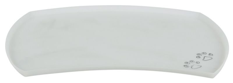 Zapobiega przesuwaniu się misek podczas jedzenia, dodatkowo pomaga w utrzymaniu czystości wokół nich. Jest wykonana z silikonu, dzięki czemu ma doskonałe właściwości antypoślizgowe. Świetnie zabezpiecza każdą podłogę przed brudem i wodą. Antypoślizgowa mata pod miski jest półprzeźroczysta, w prawym dolnym rogu znajduje się motyw łapek. Posiada podwyższone brzegi, co zapobiega przelewaniu się wody poza matę. Świetnie nadaje się także jako podkładka pod fontanny, poidła automatyczne dla psa i kota.