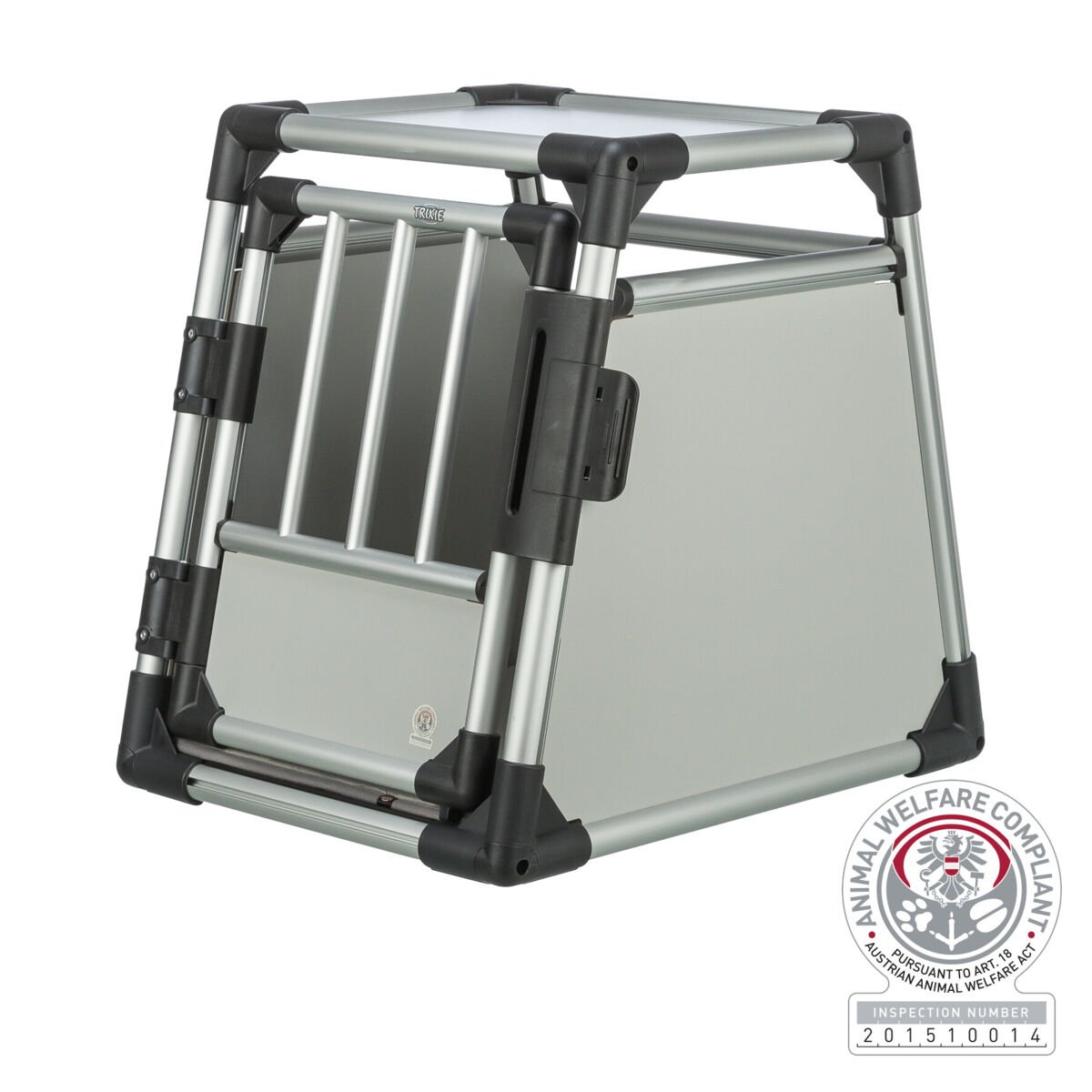 Transporter z aluminiową konstrukcją. Wysoka jakość, bezpieczny i bardzo cichy. Kompaktowe panele zapewniają bezpieczeństwo. Nie zasłania tylnej szyby. Idealnie wykorzystuje przestrzeń bagażnika w samochodzie, dzięki skośnym bokom. Drzwi zabezpieczone na zamek. Zamknięte dolne drzwi zapobiegają wystawaniu łap. Z matami antypoślizgowymi: prac w temperaturze do 30 °C. Rzepy przy podstawie zapewniają dobra przyczepność w bagażniku.