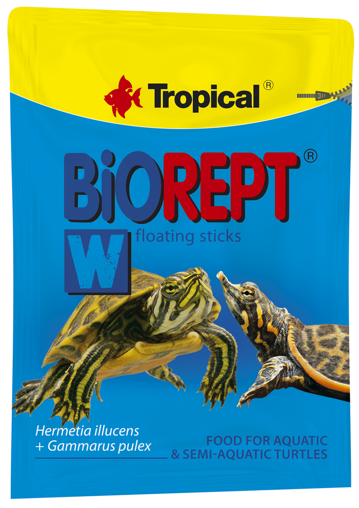 Żółwie związane ze środowiskiem wodnym to zwierzęta wszystkożerne i mięsożerne. Aby zaspokoić ich potrzeby, przygotowaliśmy Biorept W – wieloskładnikowy pokarm w formie pałeczek do codziennego podawania. Zawiera dodatek skorupiaków, w tym gammarus, wzbogacający pokarm o wartościowe białko, chitynę oraz nienasycone kwasy tłuszczowe (omega-3 i omega-6). Pokarm ten został wzbogacony o larwy Hermetia illucens (Black Soldier Fly). Jest to cenny surowiec bogaty w niezbędne aminokwasy, kwasy tłuszczowe, makro- i mikroelementy. Zawiera wysoce przyswajalny wapń, fosfor i magnez, które odgrywają ważną rolę w rozwoju i utrzymaniu kości w dobrym stanie. Posiada niespotykany u innych owadów, korzystny stosunek wapnia do fosforu. Stężenie wapnia występujące w Hermetia illucens jest znacznie wyższe niż w mleku. Znakomity smak pałeczek sprawia, że zwierzęta bardzo chętnie je zjadają.