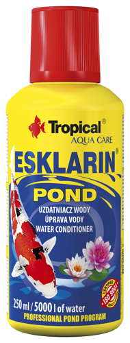 Esklarin Pond zalecany jest szczególnie przy zakładaniu nowego oczka, podczas podmian wody, kwarantanny i rekonwalescencji. Esklarin Pond neutralizuje trujące dla ryb sole metali ciężkich oraz chroni skórę, skrzela i oczy ryb przed agresywnym działaniem świeżej wody wodociągowej. Dodatek substancji o działaniu antystresowym uspokaja ryby wystraszone zabiegami porządkowymi w oczku, transportem i aklimatyzacją do nowych warunków. Aloes łagodzi otarcia i przyspiesza regenerację uszkodzonego naskórka, zmniejszając ryzyko wystąpienia stanów zapalnych. Ponadto aktywuje układ odpornościowy ryb i wpływa korzystnie na pracę przewodu pokarmowego. Gdy istnieje potrzeba szybkiego wpuszczenia ryb do świeżej wody, zalecamy wcześniejsze użycie preparatu Antychlor Pond oraz silne napowietrzanie wody. Po kilkunastu minutach od zastosowania Antychloru Pond do oczka wodnego należy wlać odpowiednią ilość Esklarinu Pond. Zalecamy również używanie preparatu z bakteriami do oczek Bactinin Pond.