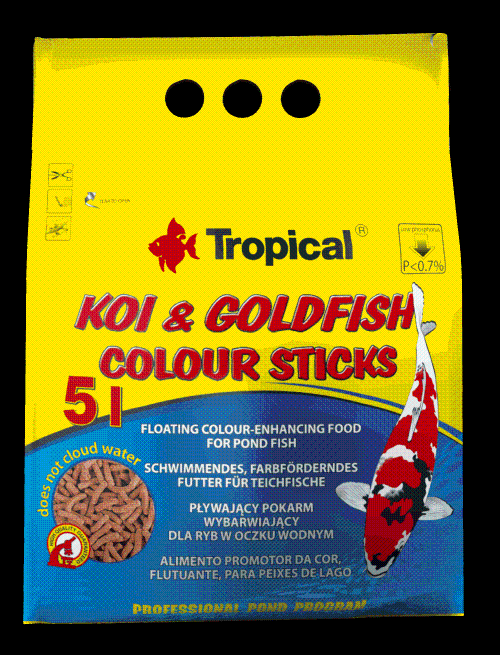Koi & Goldfish Colour Sticks to pełnoporcjowy pokarm wybarwiający w postaci pływających pałeczek, dla wszystkich kolorowych karpi koi, złotych rybek oraz innych barwnych, ozdobnych ryb karpiowatych hodowanych w stawkach ogrodowych i sadzawkach. Regularnie podawany wydatnie intensyfikuje czerwone i złote ubarwienie. Struktura pałeczek powoduje, że pokarm utrzymuje się długo na powierzchni wody. Ułatwia to obserwację żerujących ryb i pozwala kontrolować ilość przyjmowanego przez nie pokarmu. Nadmiar pałeczek można łatwo usunąć z oczka wodnego przy pomocy siatki do ryb.