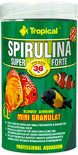 Super Spirulina Forte Mini Granulat to roślinny pokarm dla ryb w formie drobnego granulatu z wysoką (36%) zawartością spiruliny. Linia Premium to gotowe pokarmy z wieloma atrakcyjnymi dodatkami, które zapewniają rybom m.in. doskonałą kondycję, piękne kolory i większą odporność na choroby. Linia Premium obejmuje zarówno produkty uniwersalne, jak i specjalistyczne, przeznaczone do żywienia ryb o szczególnych wymaganiach pokarmowych.