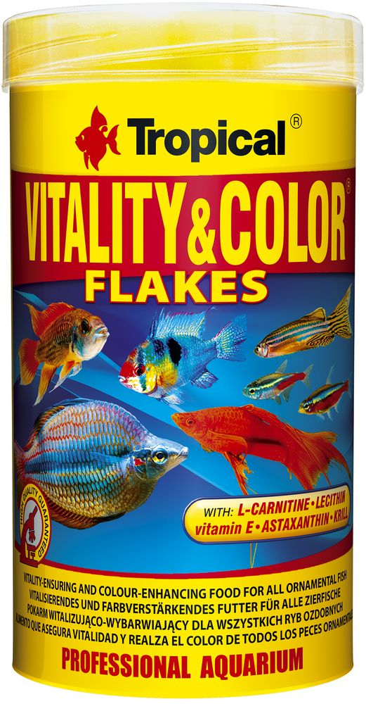 Obecna w pokarmie naturalna astaksantyna intensyfikuje barwy ryb oraz wpływa korzystnie na przebieg wielu procesów fizjologicznych, w tym rozmnażanie oraz ochronę komórek przed szkodliwym działaniem wolnych rodników. Aby ryby mogły lepiej wykorzystać zawarte w pokarmie tłuszcze, pokarm Vitality & Color został wzbogacony o L-karnitynę, która wspomaga metabolizm tłuszczów. Regularne stosowanie Vitality & Color sprawia, że ryby równomiernie rosną, dojrzewają i chętnie przystępują do tarła.
