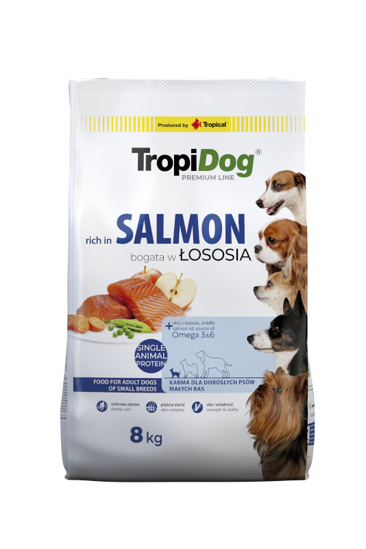TropiDog Premium Adult Small Breeds to karma Premium bogata w łososia, z ryżem, dla dorosłych psów małych ras (od 10 miesiąca życia). Zawiera wysoko przyswajalne białko z łososia oraz olej z łososia, a także warzywa, owoce i glony kelp. Ta optymalnie zbilansowana karma pokrywa duże potrzeby energetyczne psów małych ras, a jej wysokie walory smakowe pobudzają apetyt nawet bardzo wymagających osobników.
