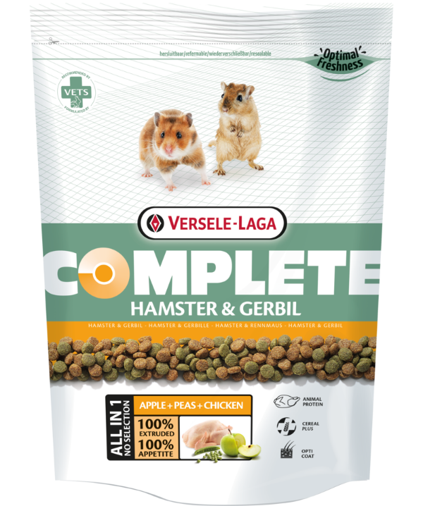 Versele-Laga Complete Hamster & Gerbil to żywienie bez zmartwień. Niezwykle smaczne ekstrudaty przygotowane wg koncepcji "wszystko w jednym" zapobiegają selektywnemu pobieraniu pokarmu. Dzięki temu Twój chomik albo myszkoskoczek otrzymuje wszystkie niezbędne substancje odżywcze pozwalające mu cieszyć się pełnią zdrowia. Pokarm zawierający kurczaka, jako naturalne źródło zwierzęcych protein oraz zboża dające energię i witalność dostosowany jest do potrzeb żywieniowych chomików i myszkoskoczków. Skład wzbogacony warzywami i owocami. Zawiera m in. wyciąg z jukki, co redukuje nieprzyjemny zapach. Olej z łososia i siemię lniane jako źródło kwasów omega 3 i omega 6. Zapewniają piękną okrywę włosową.