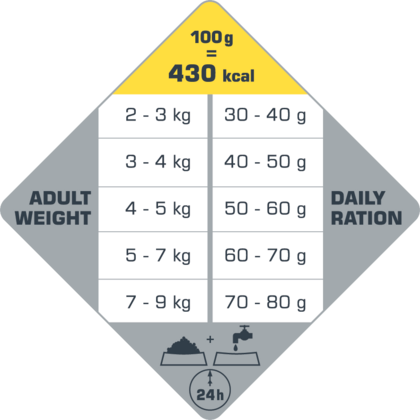 Skład: kurczak (50% suszone), ziemniaki, tłuszcze zwierzęce, groch, błonnik roślinny (celuloza 2,5%, wysłodki buraczane 1%), hydrolizowane białka zwierzęce, łosoś, olej z łososia, drożdże piwne, minerały, suszone całe jaja, FOS (0,3%) MOS (0,1%), algi morskie (Ascophyllum nodosum), juka (250 mg/kg), rozmaryn (14 mg/kg), zielona herbata (10 mg/kg)