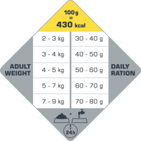 Skład analitycznie: protein 40.0% (*90.0% animal protein in the total protein content), fat content 20.0%, crude ash 9%, crude fibre 2.5%, calcium 1.2%, phosphorus 1.0%, taurine 3300 mg/kg