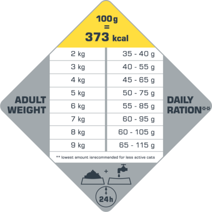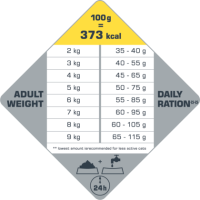 Skład analitycznie: protein 40% (*84.0% animal protein in the total protein content), fat content 12.0%, crude ash 8.5%, crude fibre 5.0%, calcium 1.2%, phosphorus 1.0%, taurine 4400 mg/kg