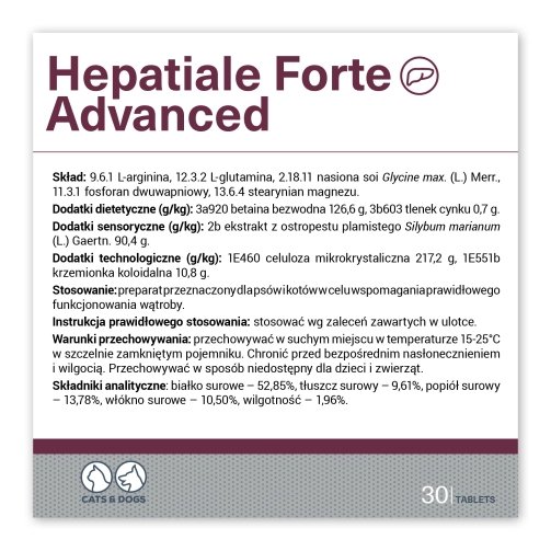 Hepatiale Forte Advanced to bogaty skład, kompleksowo wspomagający funkcje wątroby i jej powrót do prawidłowego funkcjonowania oraz regenerację hepatocytów (komórek wątroby). Stworzony z myślą o psach i kotach z podejrzeniem chorób wątroby, jak również ze stwierdzonym zapaleniem lub zatruciem wątroby oraz upośledzeniem wydzielania żółci lub jej zastojem.