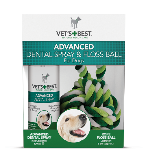 Podwójna kombinacja Vet's Best Dental Spray i sznurkowej piłki pomaga zredukować płytkę nazębną oraz kamień nazębny, jednocześnie odświeżając oddech psów.