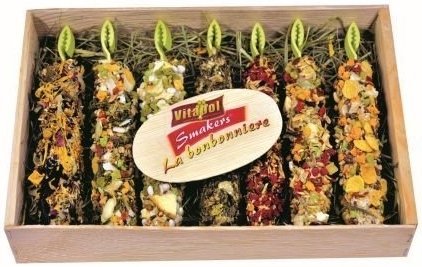 Doskonały prezent dla każdego małego gryzoni lub królika. Drewniana skrzynka z 7 różnymi, najlepszymi kompozycjami smakowymi Smakersów. Doskonała przekąska na każdy dzień. Uzupełnia dietę małych pupili. Dzięki niespotykanej technologii produkcji dostarczają naturalnych witamin i minerałów ze składników, w które są bogate. W 80% wykonywane ręcznie. Odpowiednia twardość zapewnia, że oprócz wartości odżywczych Smakersy Vitapol dbają również o regularne ścieranie siekaczy u gryzoni i królików.
