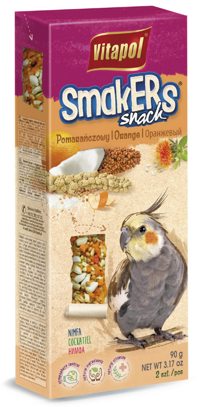 Uzupełniający pokarm o smaku pomarańczowym dla nimfy. Smakers z dodatkiem pomarańczy doskonale uzupełniający dietę papużek we flawonoidy, witaminę C, karoten oraz pektyny dzięki obecności pomarańczy. Flawonoidy posiadają właściwości przeciwzapalne, przeciwbakteryjne, przeciwgrzybiczne. Idealnie uzupełnia codzienną dietę zwierząt. W 80% wykonywane ręcznie.