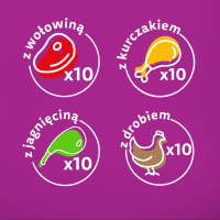 Whiskas Adult Klasyczne Posiłki W Sosie to zbilansowana mokra karma dla dorosłych kotów, przygotowana z wysokiej jakości składników, które zachowują naturalny smak i wartości odżywcze. Kawałki w sosie w czterech wariantach smakowych — wołowina, kurczak, jagnięcina i drób — zaspokoją apetyt nawet najbardziej wybrednych kotów.