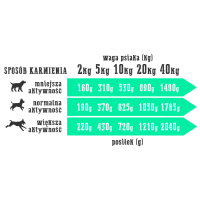| Aktywność psa | 2kg | 5kg | 10kg | 20kg | 40kg |