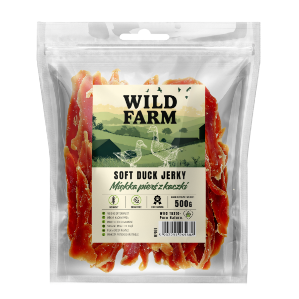 WILD FARM Miękka Pierś z Kaczki to naturalny przysmak dla psów wszystkich ras i w każdym wieku. Zawiera aż 94% mięsa z kaczki, co zapewnia intensywny smak, wysoką strawność oraz wartościowe białko wspierające rozwój i regenerację mięśni.