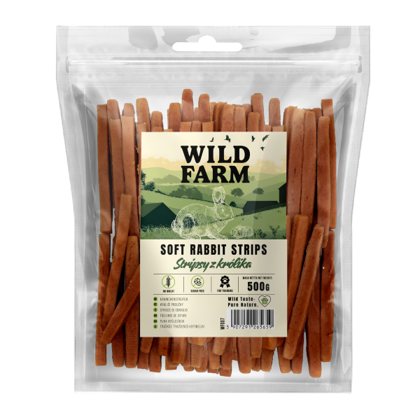 Mięsne paski z aż 80% królika i jego produktów ubocznych, idealne jako przekąska, nagroda podczas treningu lub uzupełnienie codziennej diety psa.